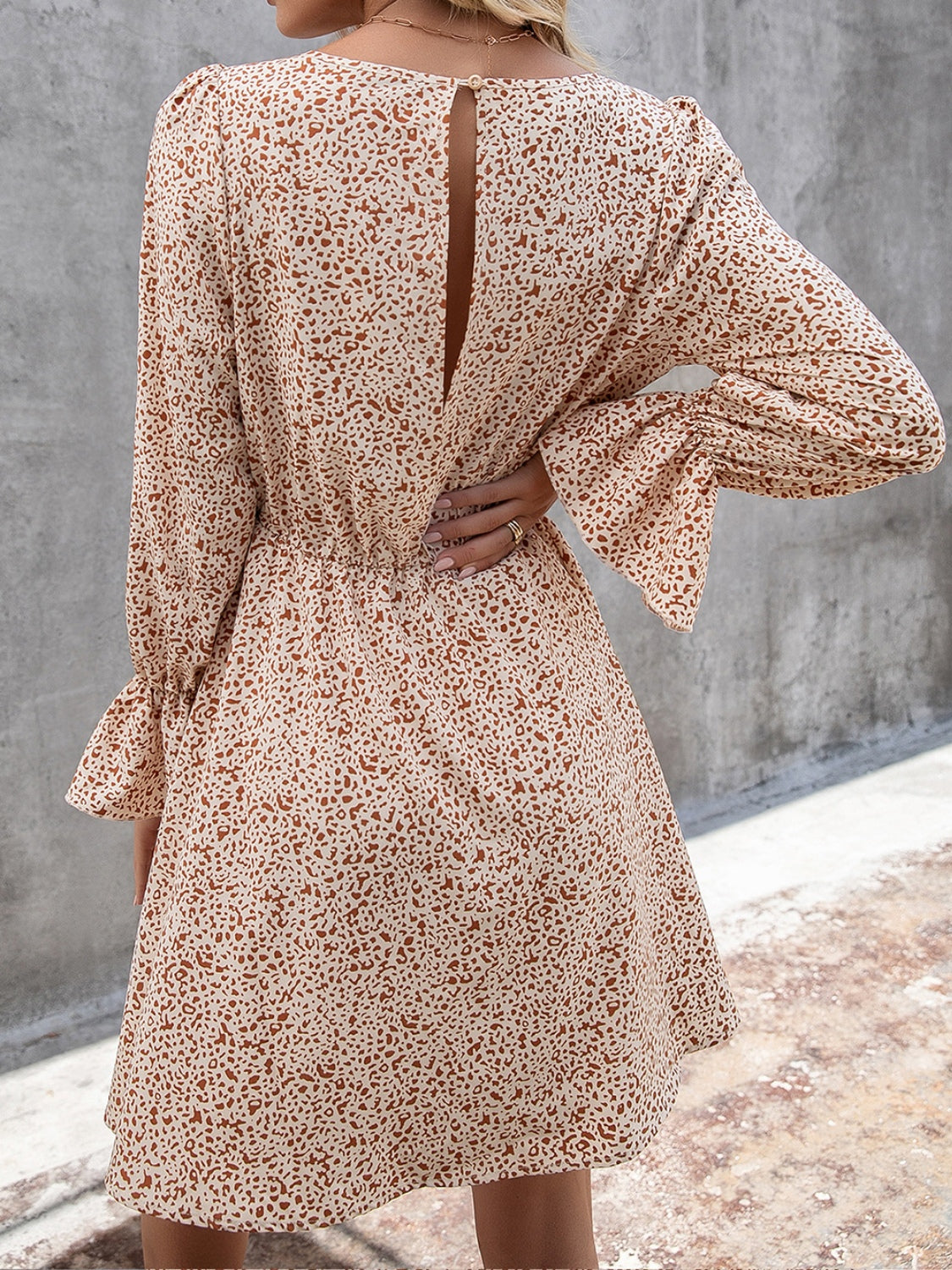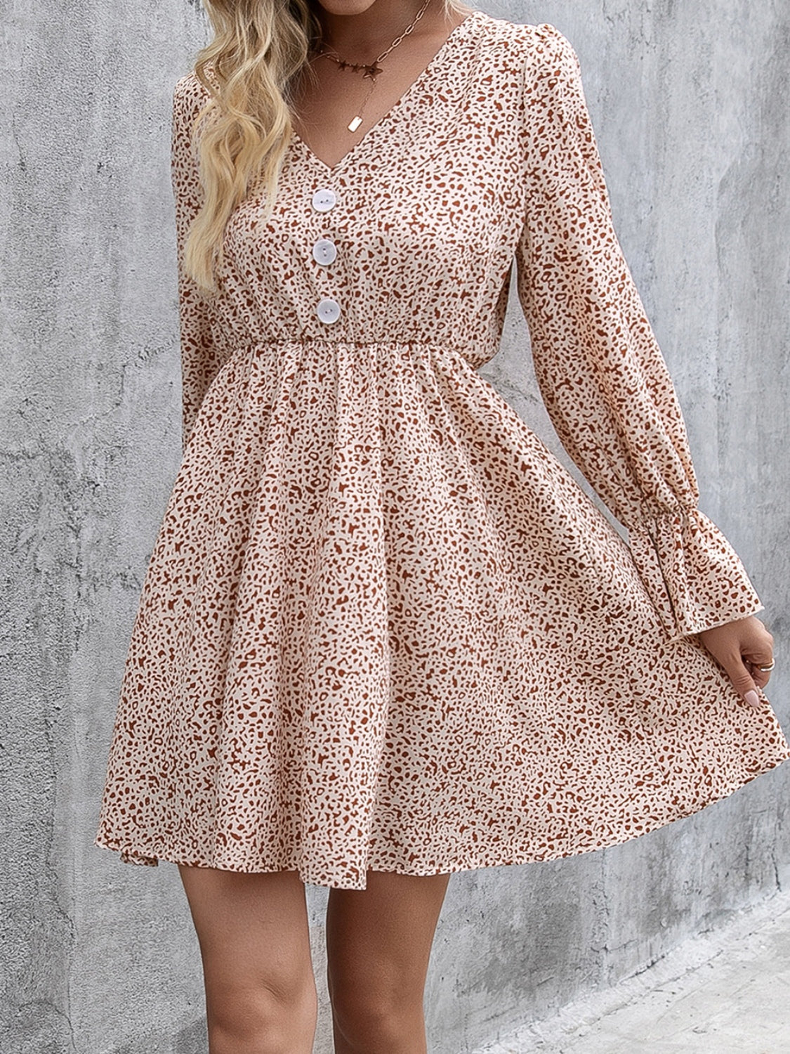Decorative Button V-Neck Flounce Sleeve Dress