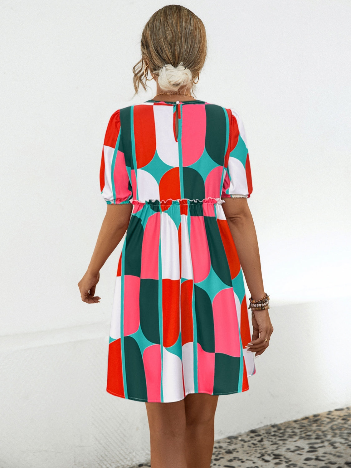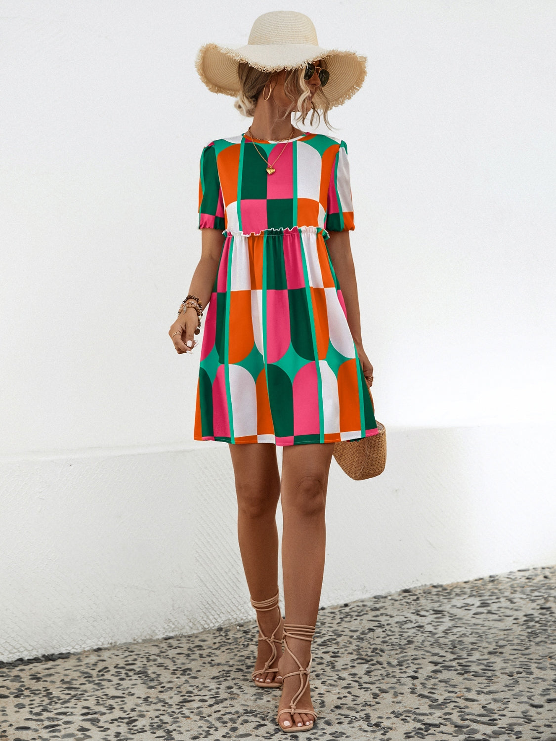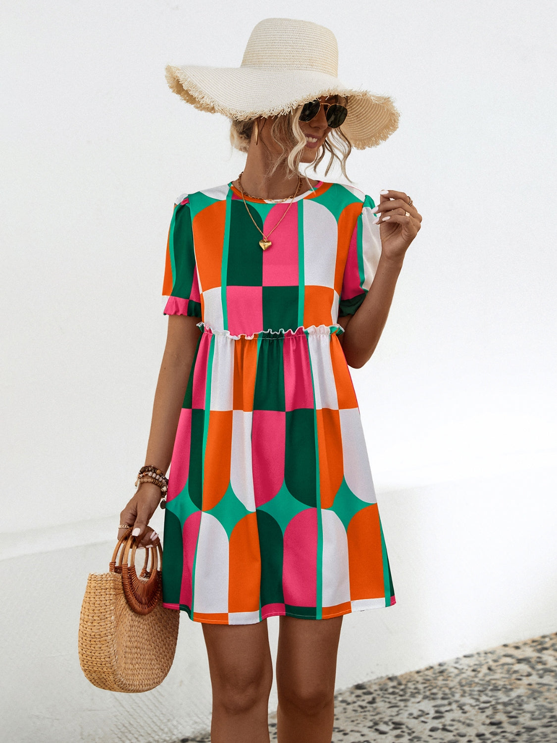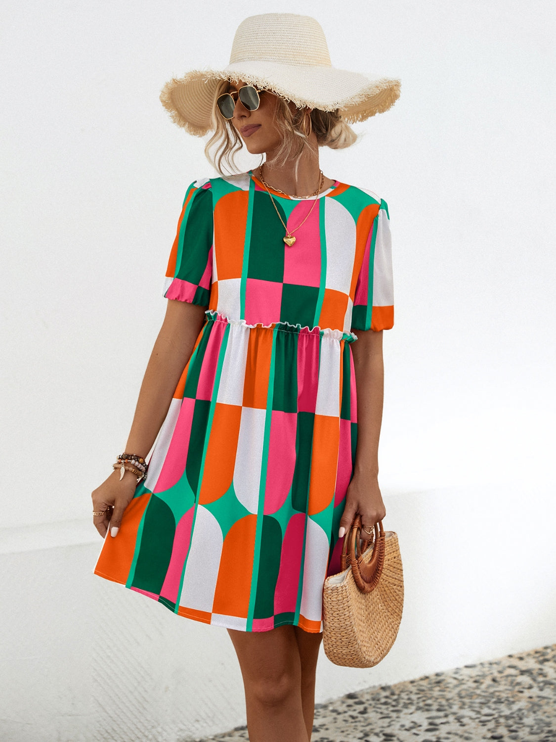 Geometric Frill Round Neck Short Sleeve Dress