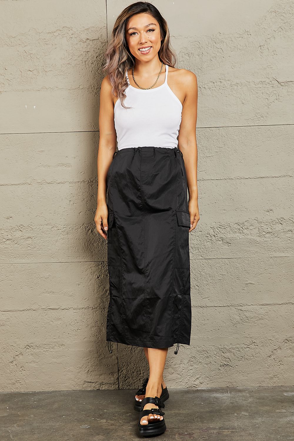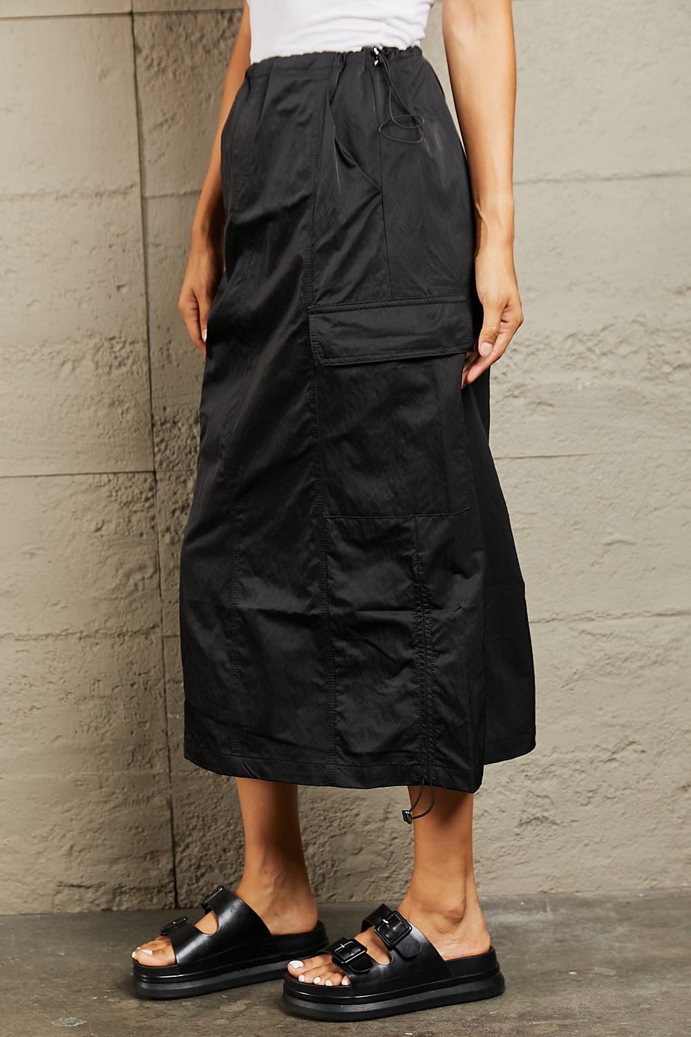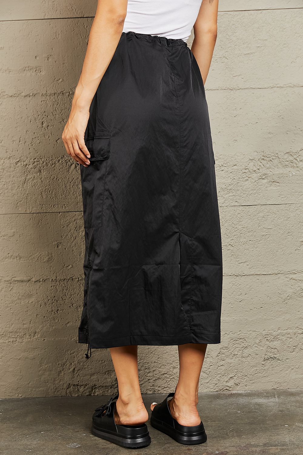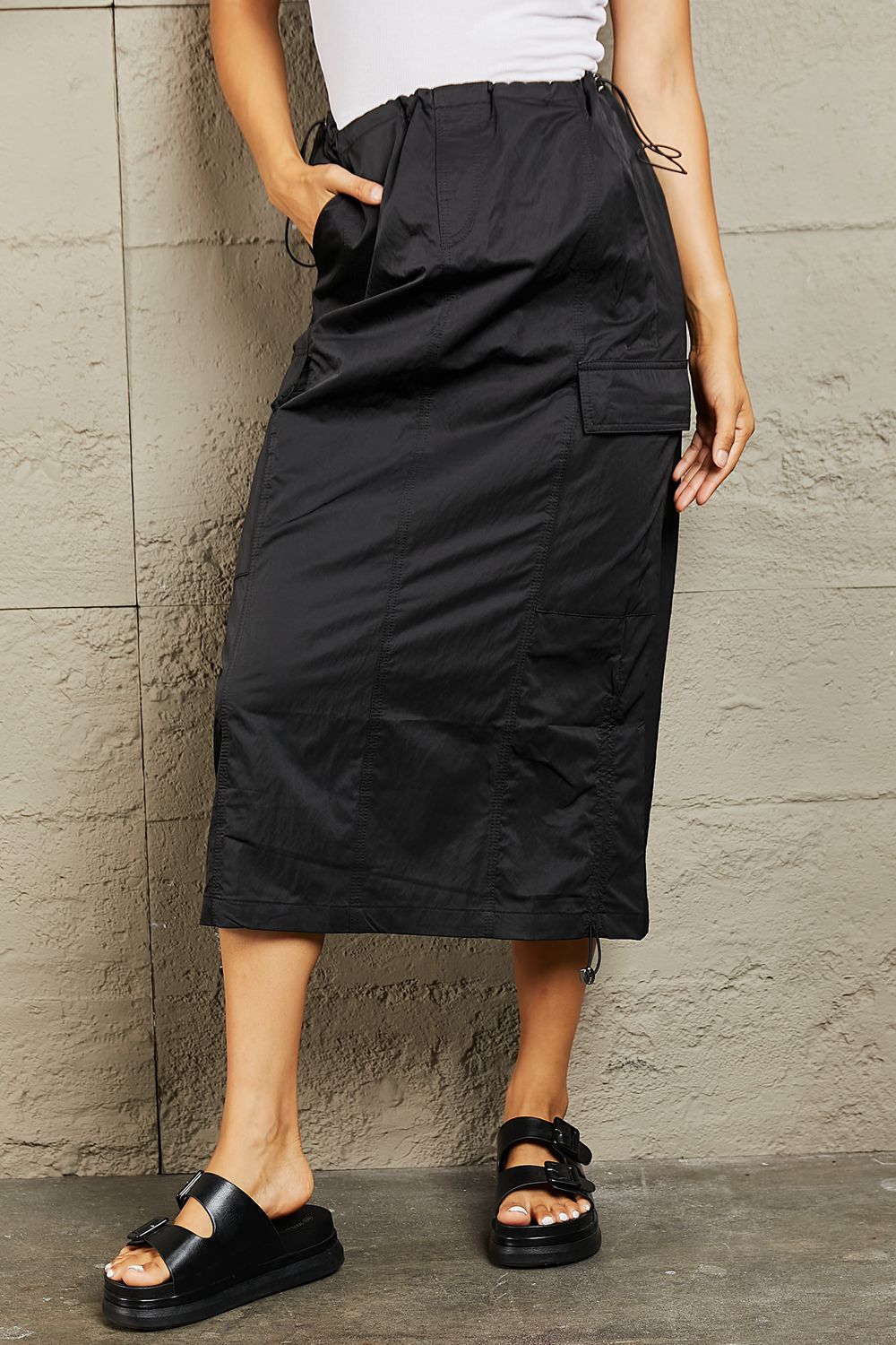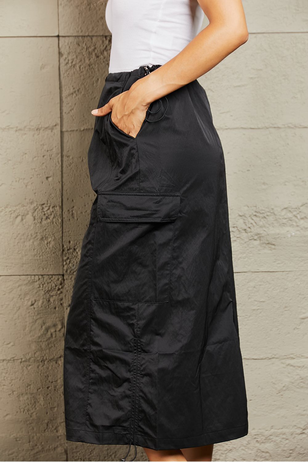 Crafted with a flattering high-waist design, this midi skirt accentuates your curves while offering a comfortable fit. The elastic scrunch detail adds a touch of elegance and ensures a secure fit around the waist. With ample cargo pockets, it's both fashionable and practical, providing ample space for your essentials while adding a trendy utilitarian edge to your outfit. Whether you dress it up for a chic evening look or go casual for a day out, this midi skirt is a wardrobe must-have for every fashion-forward individual.