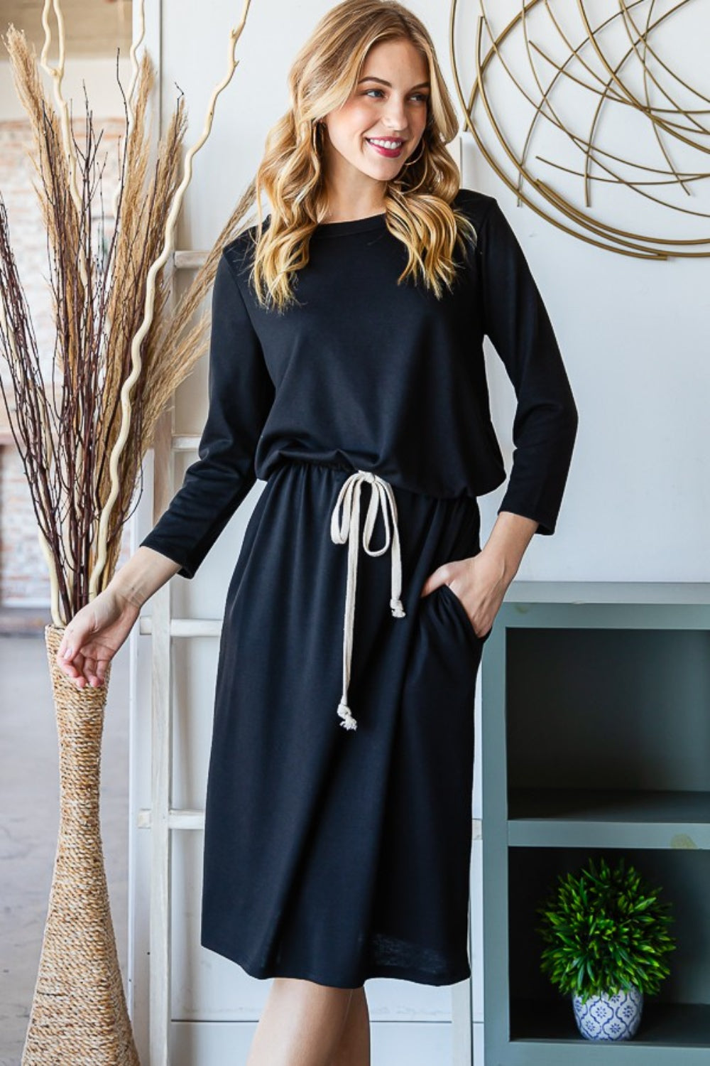 The Drawstring Waist Long Sleeve Tee Dress is a versatile and comfortable option for any casual occasion. The long sleeves provide coverage and warmth, making it perfect for transitioning seasons. The drawstring waist allows for a customizable and flattering fit, accentuating your figure and adding shape to the dress. Whether you pair it with sneakers for a relaxed look or dress it up with heels and accessories, this dress is effortlessly stylish and easy to wear. Stay comfortable and chic with this must-have tee dress.