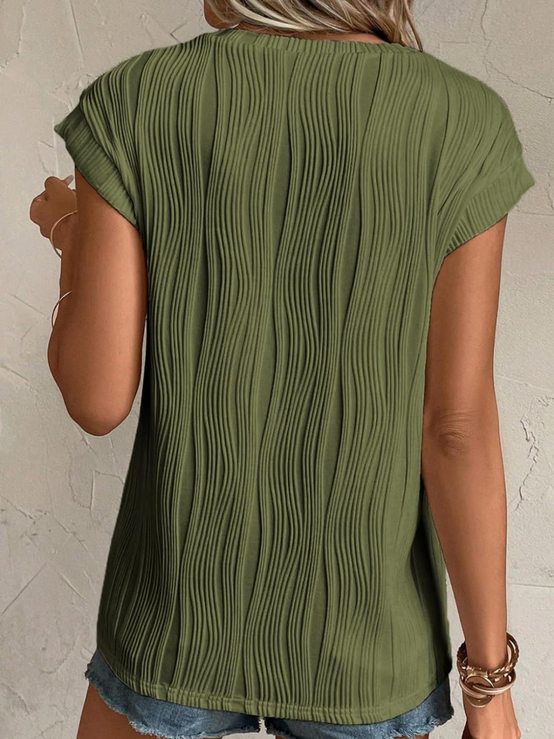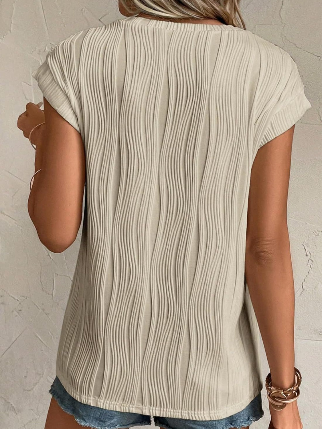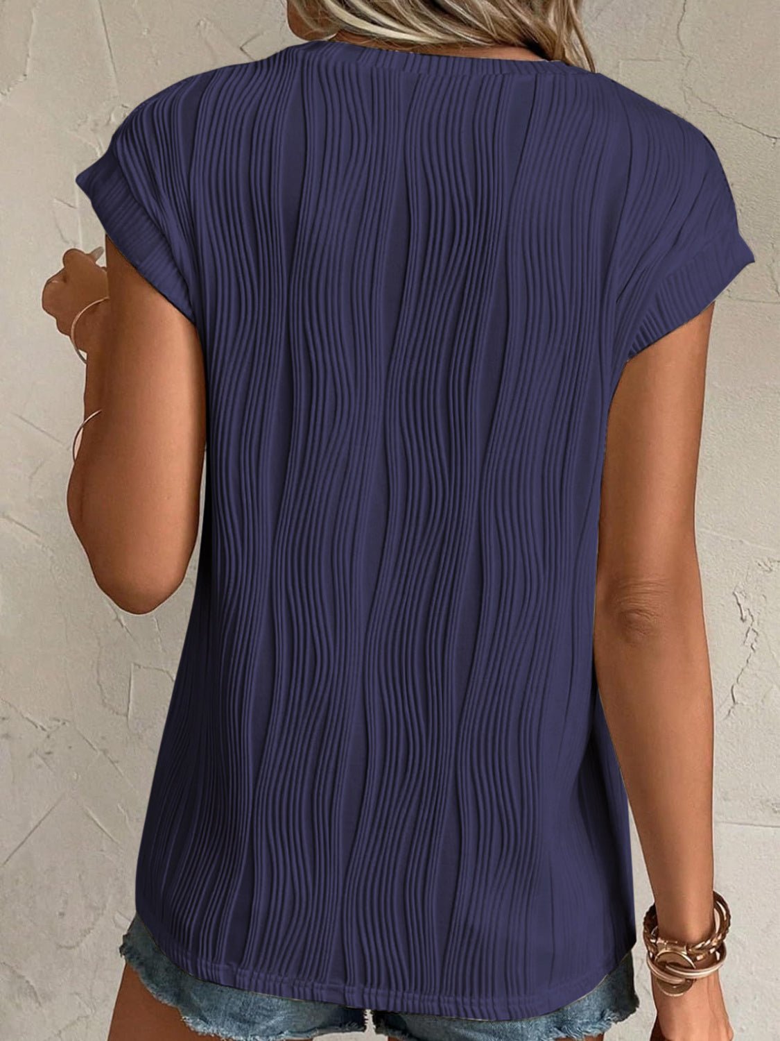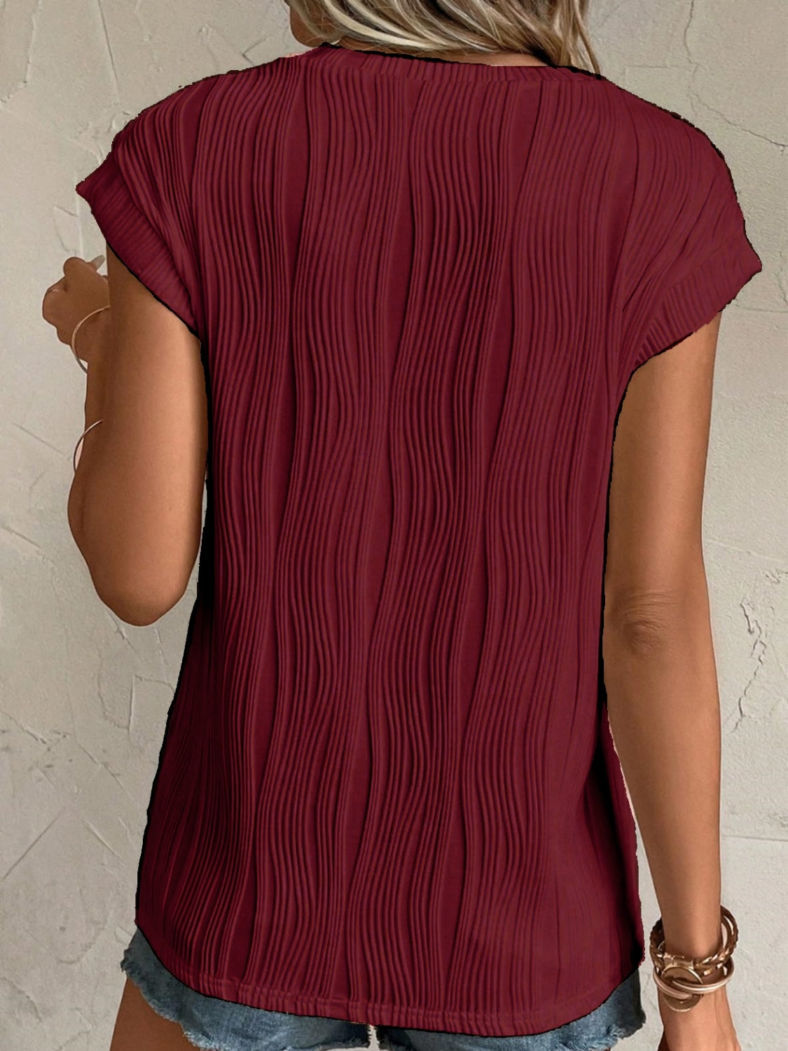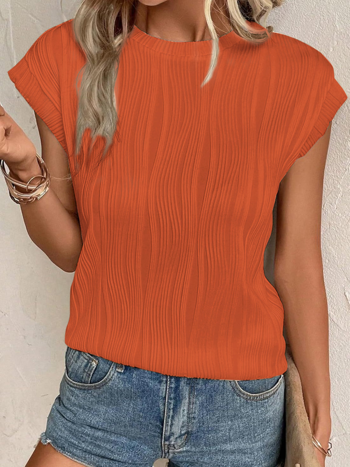 Textured Round Neck Cap Sleeve T-Shirt